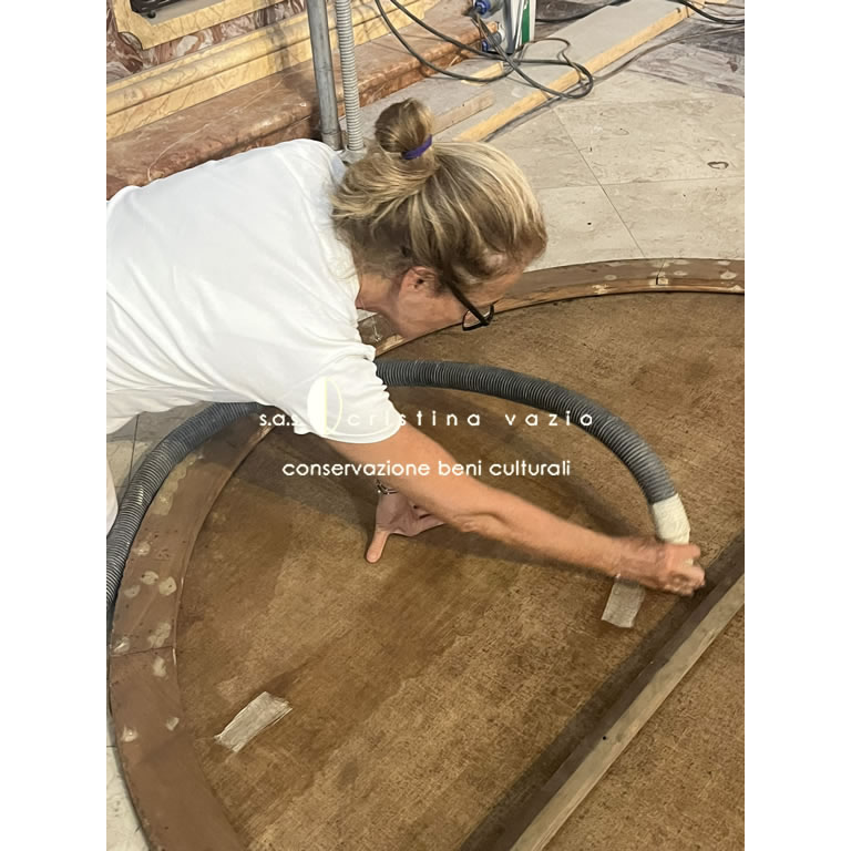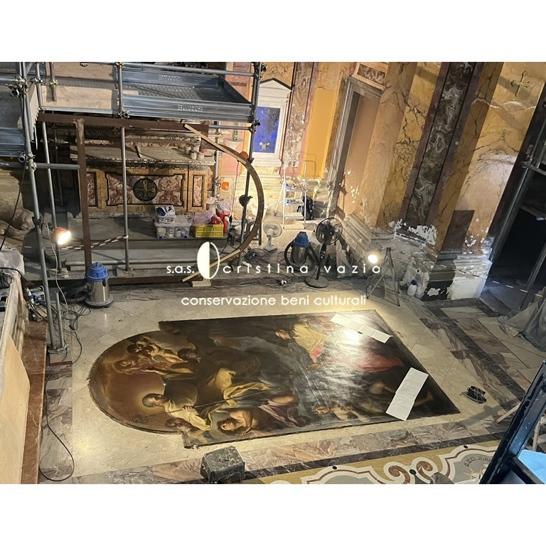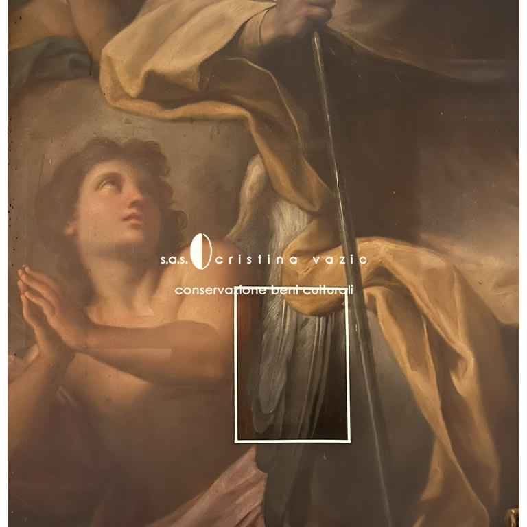 The painting on canvas is located in the right-side transept inside the SS. Andrea and Claudio dei Borgognoni Church in Rome. Made in 1739 it represents “S.Claudio who entrusts the citizens of Franche-Comté to S.Carlo Borromeo”. The complete restoration of the painting was carried out as part of the general restoration of all the decorated surfaces of the interior of the Church carried out between 2022 and 2025 (currently being published).