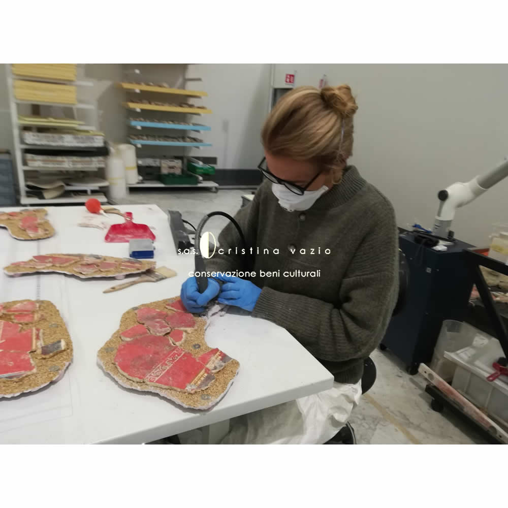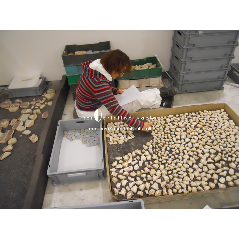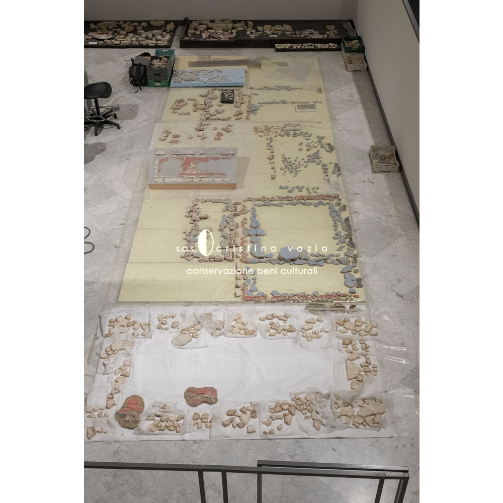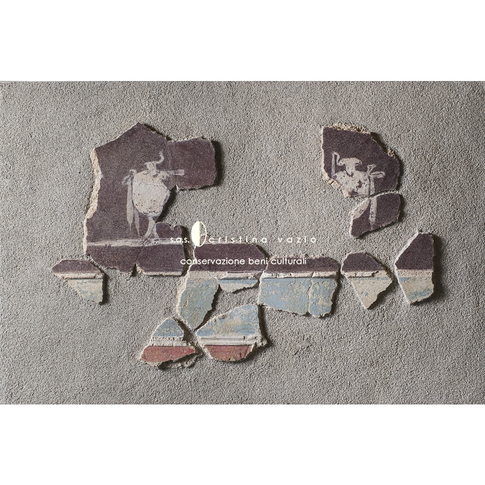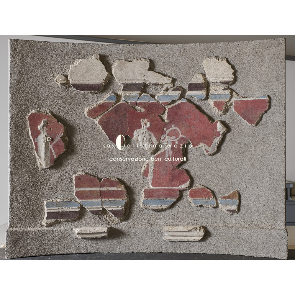 The restoration project involved the catalogation and restoration with recomposition and application on flat and curved mobile supports, of a part of fragments of the mural paintings from the monumental complex of the so-called "Baths of painted stuccoes" located in via Galvano della Volpe, Tor Vergata in Rome. The work consisted in the completion of a ICR restoration project in the laboratories at the ex Church of S.Marta in Rome, and involved the development .of a new method of intervention - currently being published - aimed at preserving the back of the old fragments.(Photo by P. Soriani)