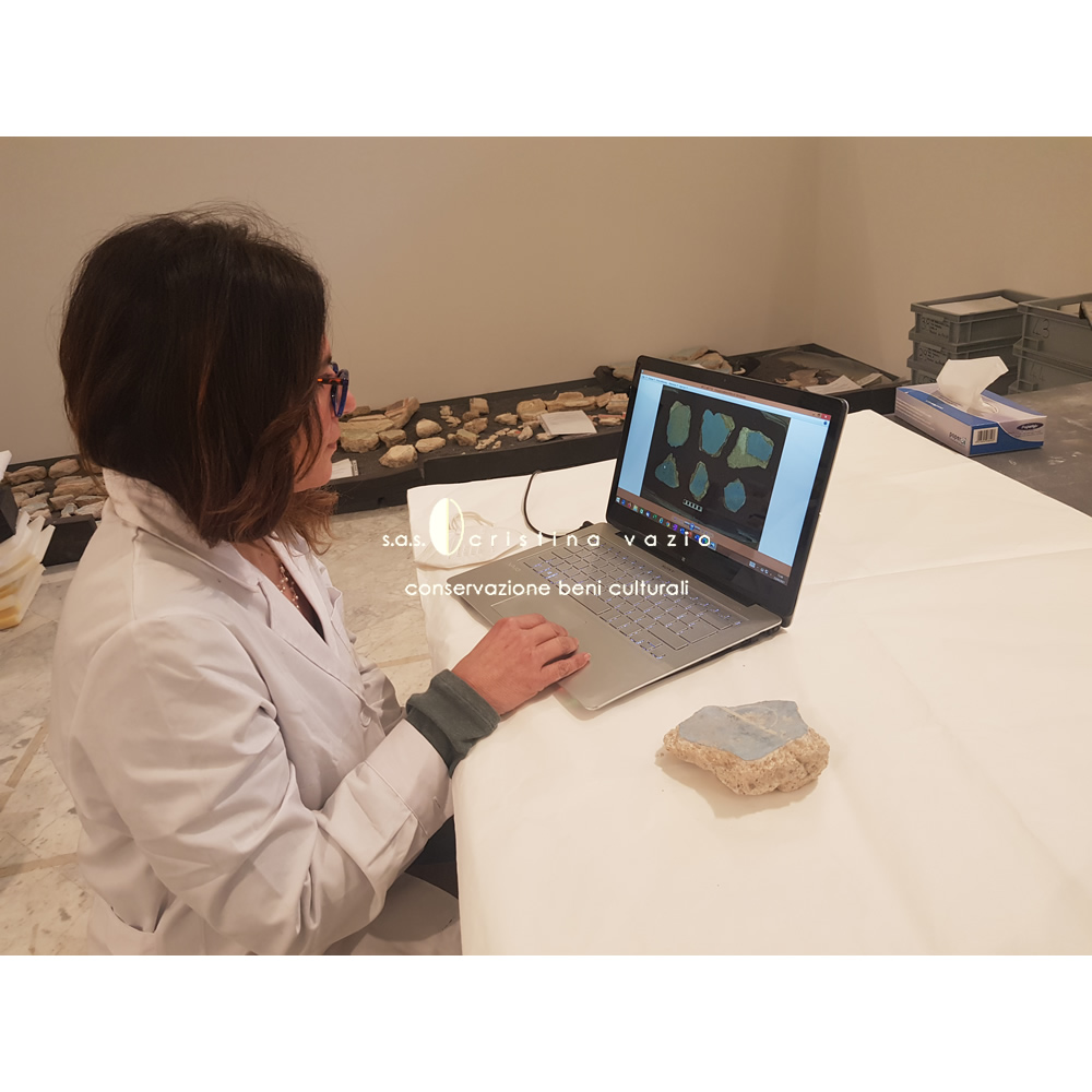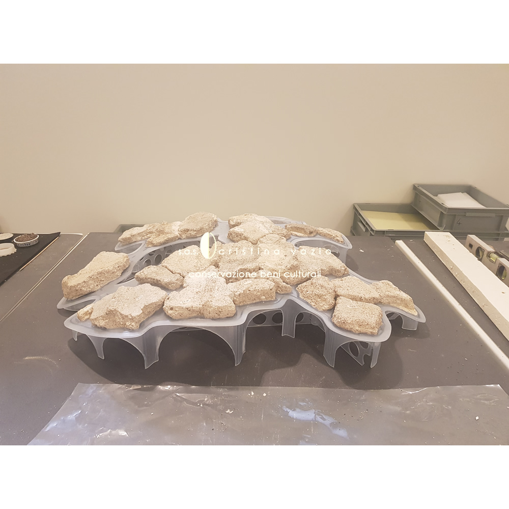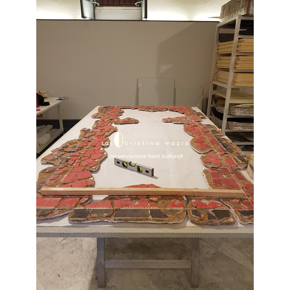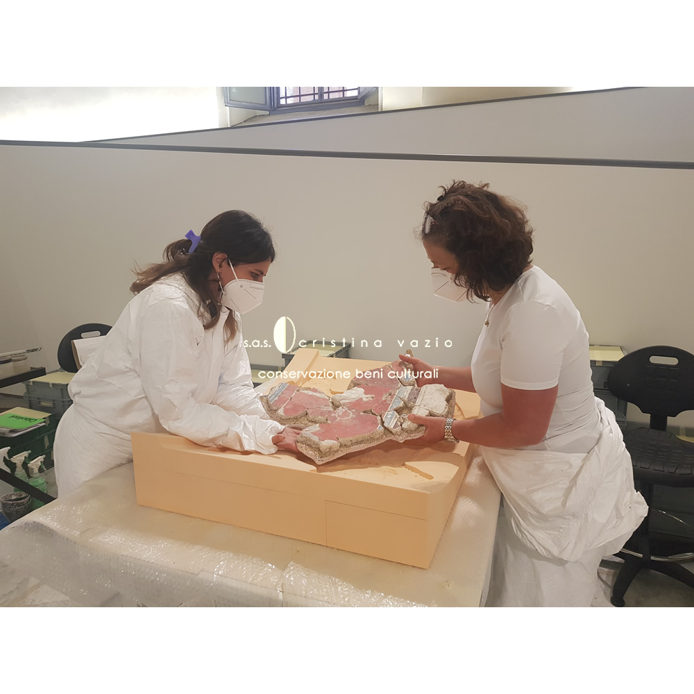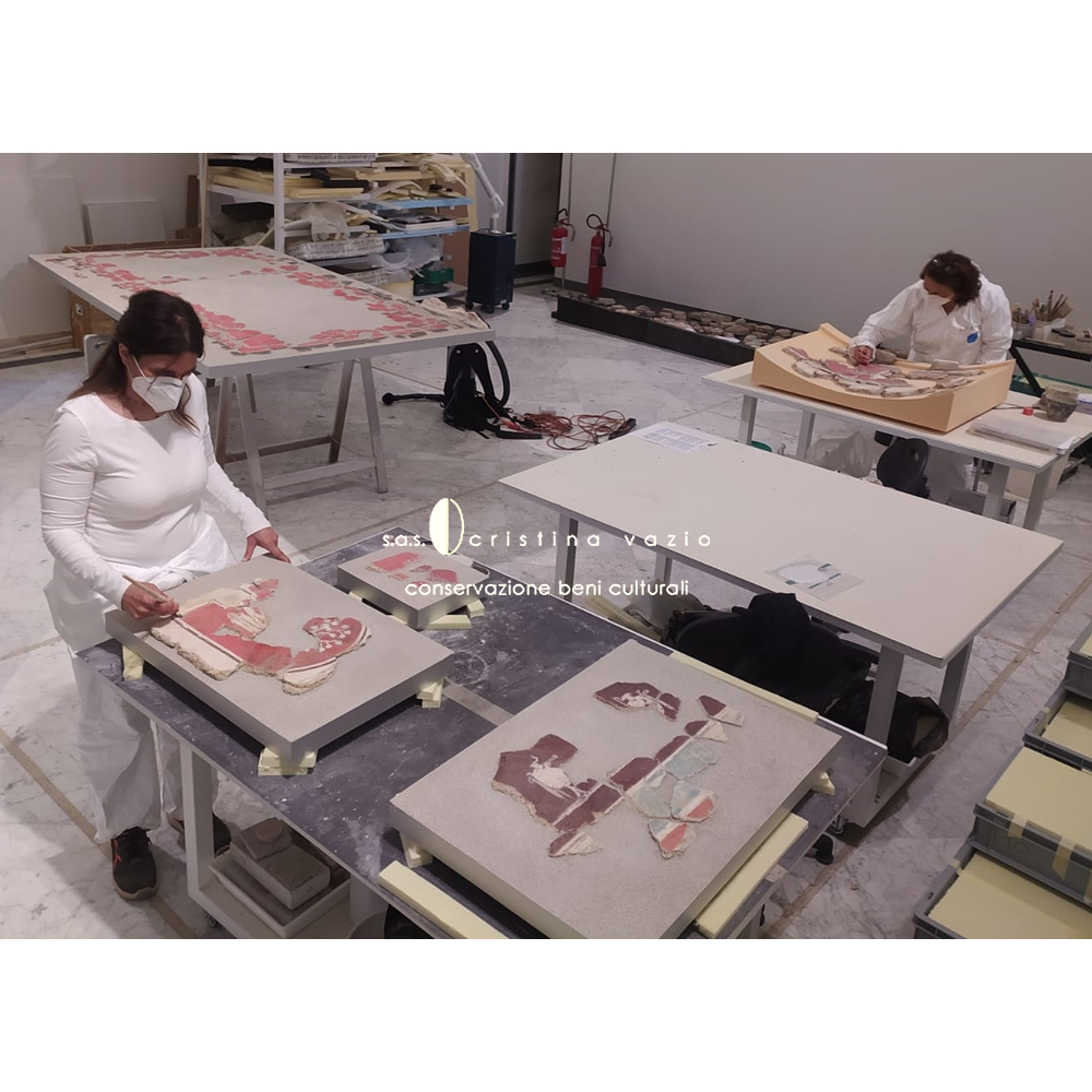 The restoration project involved the catalogation and restoration with recomposition and application on flat and curved mobile supports, of a part of fragments of the mural paintings from the monumental complex of the so-called "Baths of painted stuccoes" located in via Galvano della Volpe, Tor Vergata in Rome. The work consisted in the completion of a ICR restoration project in the laboratories at the ex Church of S.Marta in Rome, and involved the development .of a new method of intervention - currently being published - aimed at preserving the back of the old fragments.(Photo by P. Soriani)